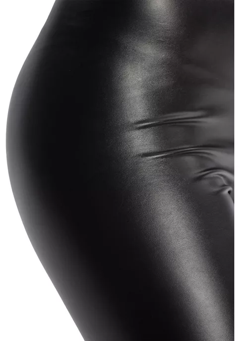 The HUE® Sleek Effect Collection features these Leatherette High-Rise Leggings. These leggings offer second-skin comfort with a super soft stretch. They feature a bonded waist and hem-stitch-free seaming. The raw-cut hem and high-rise waist make the leggings look super sleek.