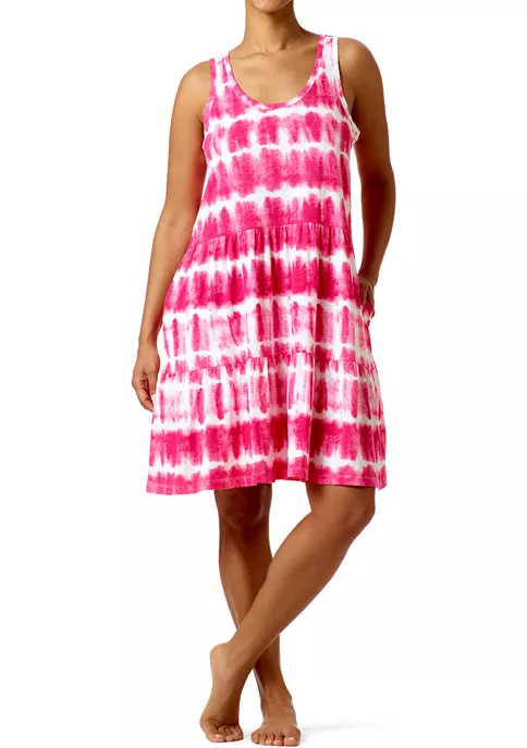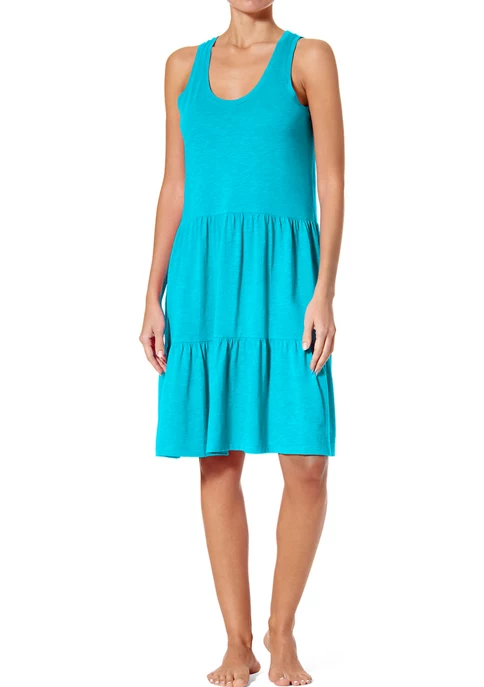 A sleeveless tiered dress featuring on-seam pockets and a low scoop neckline.