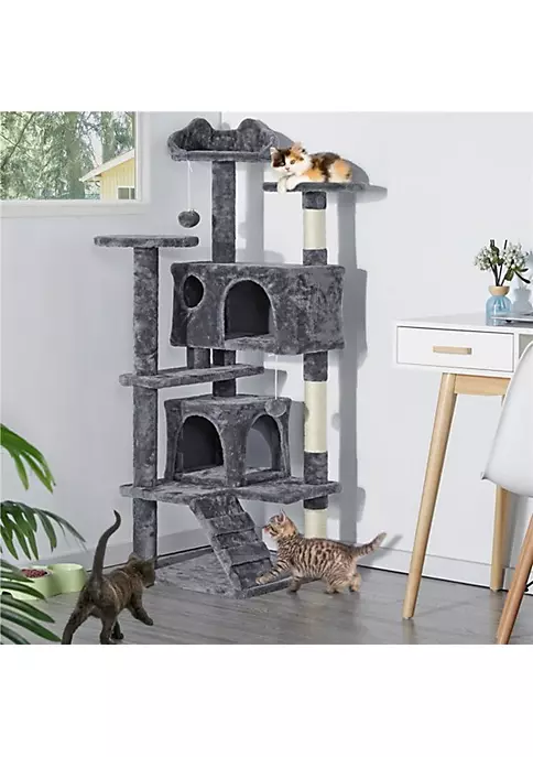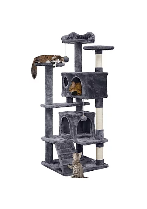 This 54” h cat tree condo is a perfect piece of furniture for families with multiple kittens. With the durable and multi-tiered design, it will entertain your cats for hours and give them a safe place to play and lounge upon. The 3 top perches offer perfect spots for resting and watching outside, enclosed 2 condos for hide-n-seek, and 3 sisal rope scratching posts for developing positive scratching behavior. Our cat tree condo fits nicely into a corner but is sturdy enough to stand alone as well.