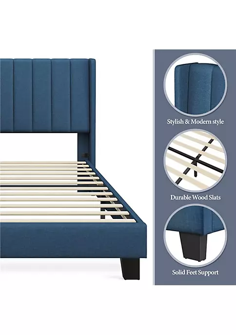 Topeakmart Queen Size Bed Frame Wingback Platform Bed Frame with Upholstered Headboard and Mattress Foundation, Navy Blue: