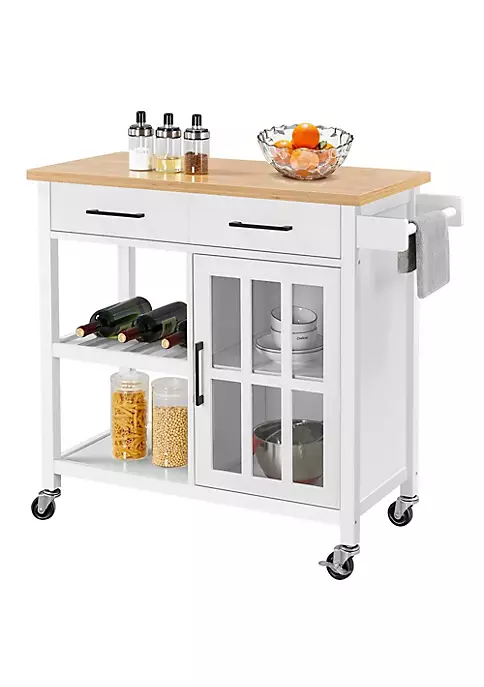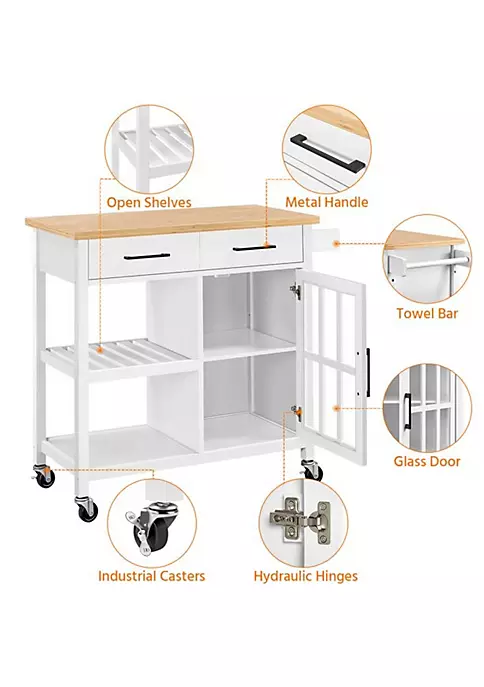 Carefully Selected Materials: Crafted from CARB P2-compliant engineered wood base, varnished bamboo countertop, and tempered glass, this quality-built kitchen island features excellent sturdiness and durability and making for your long-term use.