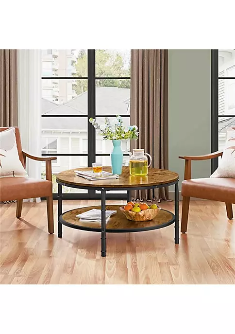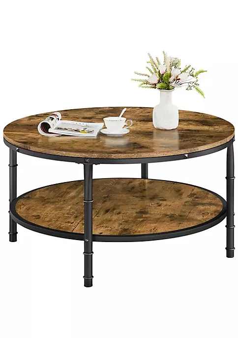 Topeakmart Rustic Round Coffee Table with Iron Mesh Storage Shelf, Rustic Brown: