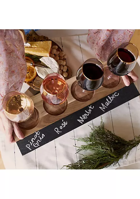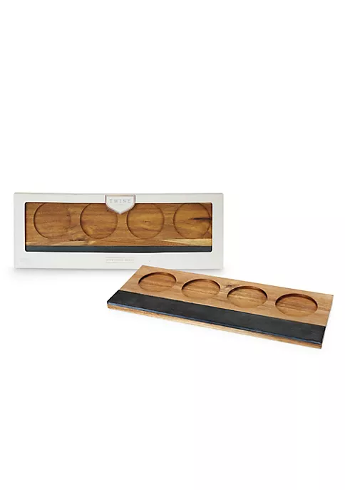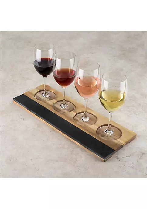 The spectacular pairing of slate and acacia wood elevates this wine flight board above all others. Four aligned cutouts hold one glass each of your signature chardonnay or bordeaux, while a smooth tapered handle ensures ease of transport from cellar to tasting room. Includes 2 pieces of soapstone chalk. Crafted from acacia wood & slate with four 3.4 inch cutouts and handles for easy transport. Measures 6.5″ x 17.25″ and holds 4 wine glasses (not included).