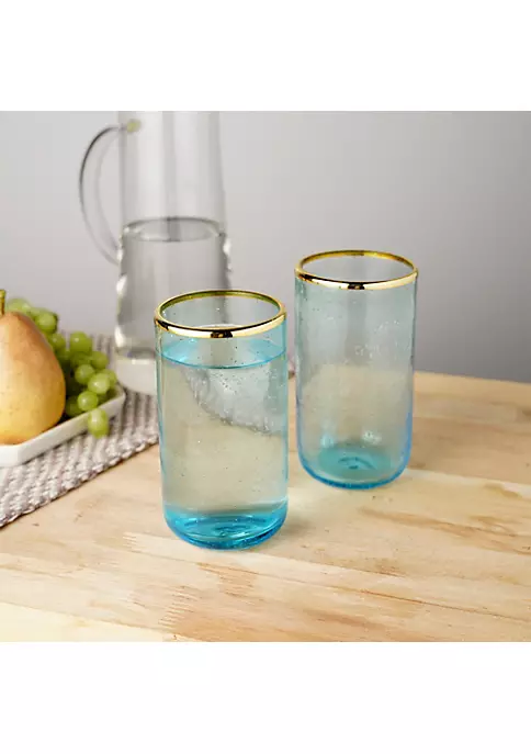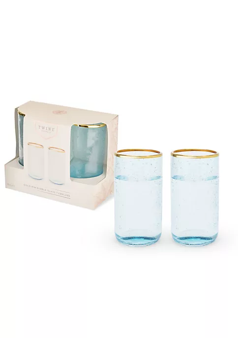 A series of delicate bubbles sit suspended in aqua-tinted glass while a laurel of gleaming gold plating adorns the rim, adding a vestige of intrigue to an already stunning set of glassware. Designed to contain 16 ounces comfortably, each tumbler is impeccably suited to accommodate any of your favorite mixed beverages.Set of 2Holds 16 ounces eachBubbled glass detailElectroplated gold rimMakes a great giftTwine crafts glassware and home goods with an emphasis on classic style, natural materials, and a nostalgic sense of quality. From elegant glassware to charming bar tools, Twine ties everything together.