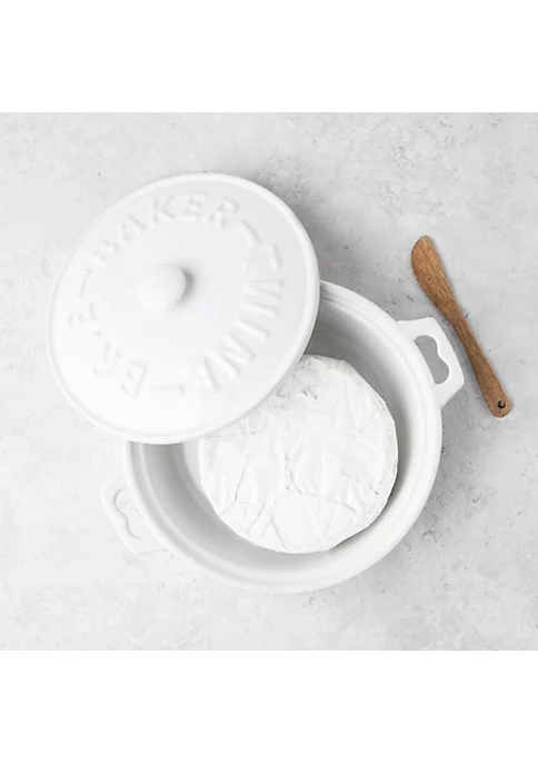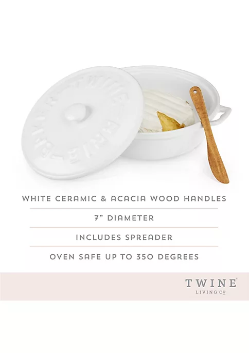 When it comes to guest-pleasing hors d’oeuvres, nothing beats baked brie. Our stoneware baker makes preparing this delectable dish easier than ever: simply top with a drizzle of honey or spread of your favorite jam, bake for 15 minutes in a 350 degree oven, & enjoy! White ceramic brie baker with lid and handles. 7 inch diameter. Oven-safe up to 350 degrees Fahrenheit. Includes acacia wood spreader.