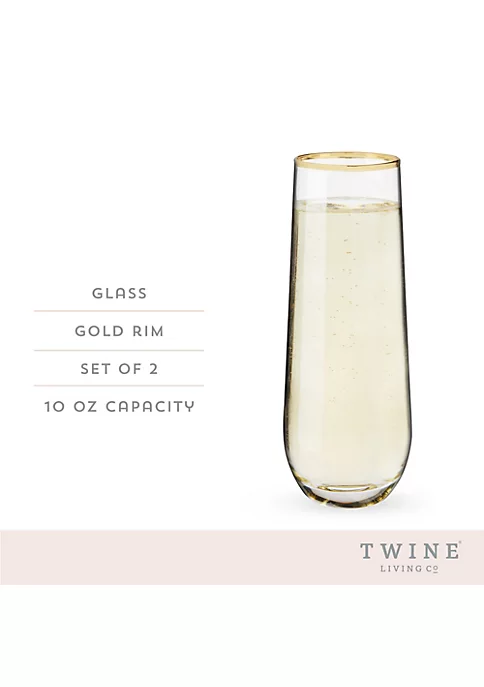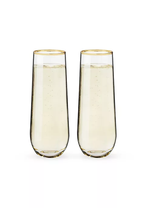 Gild your favorite vintages. With a modern stemless silhouette and dazzling gilded rim, these wine glasses add a subtle glimmer to your table. These wine flutes are perfect for any celebratory occasion or simply a quiet evening glass of sparkling wine. Set of 2 gold rimmed champagne flutes.10 oz. capacity.