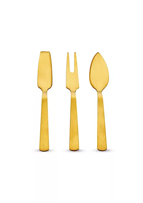 Bring regal elegance to your cheese & charcuterie with this set of gold cheese knives. Perfect for soft brie and aged cheddar alike, these cheese tools bring a luxe touch to any appetizer course. Set of 3, Hand wash recommended. Stainless Steel with gold finish.
