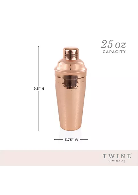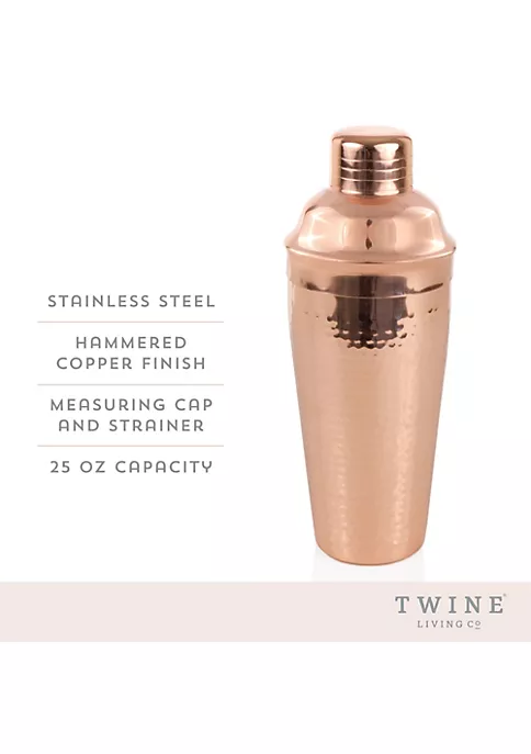 A hammered surface and gleaming copper finish draws light to this exquisite classic cocktail shaker. Complete with 1.5-ounce measuring cap and strainer, it’s an opulent take on basic barware as useful as it is lovely. Stainless steel with copper finish. Holds 25 oz. Includes built-in strainer and cap. Hand wash recommended.