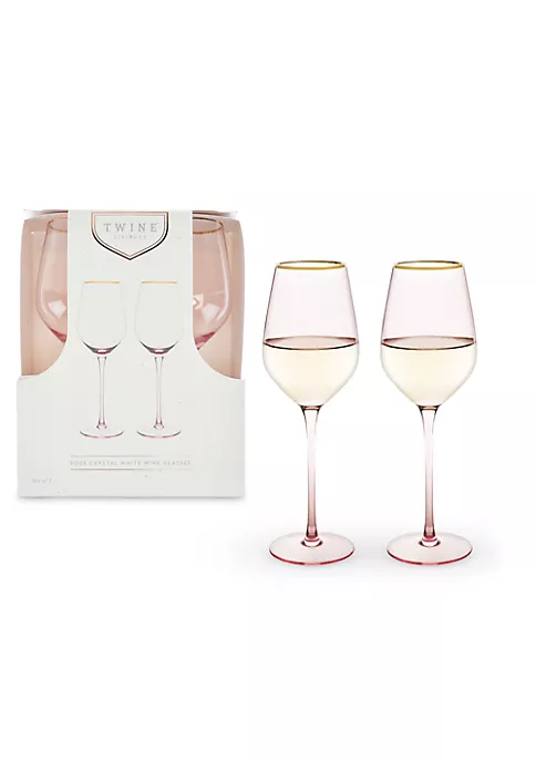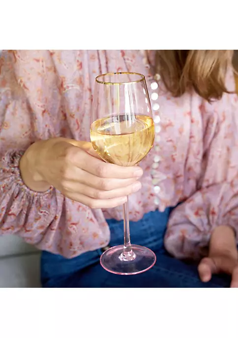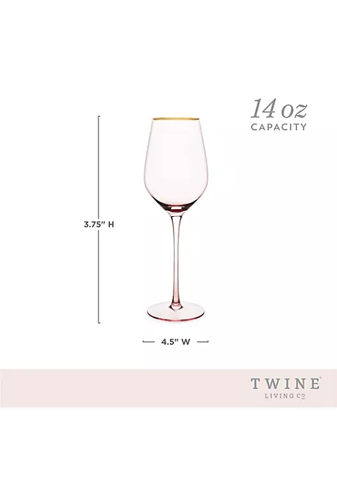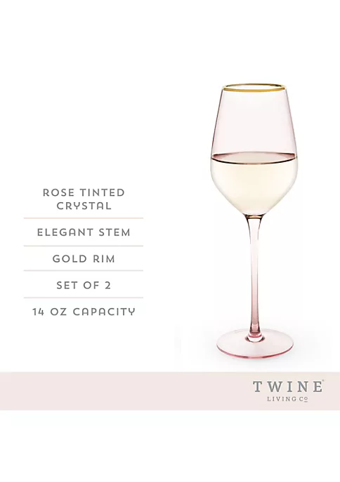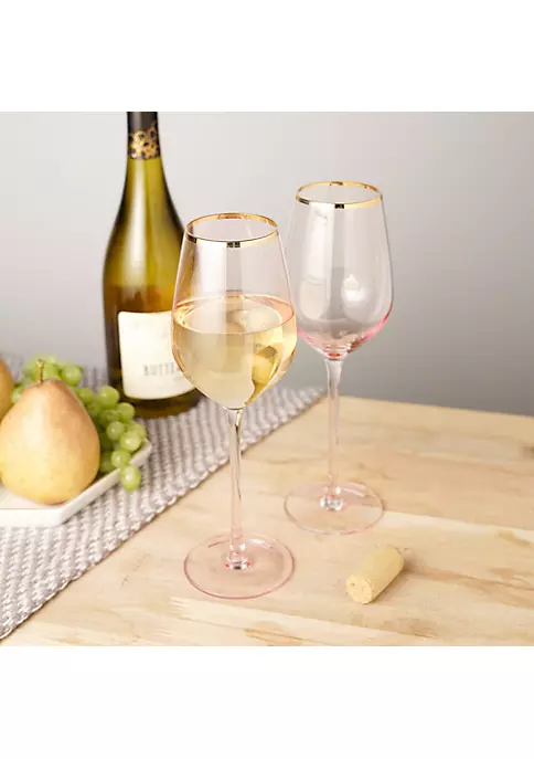 Sip your wine through rose tinted glasses. These pale pink wine glasses give a rosy hue to your favorite Sauvignon Blanc, Chardonnay, or rosé, and the electroplated gold rim adds extra sparkle to your bubbly. Set of 2 rose-tinted crystal white wine glasses. 14 oz. capacity. Gold rimmed.